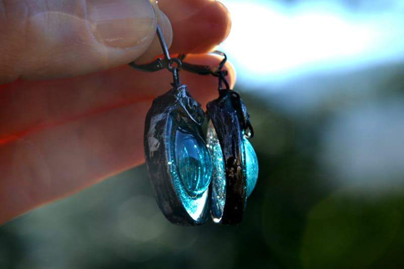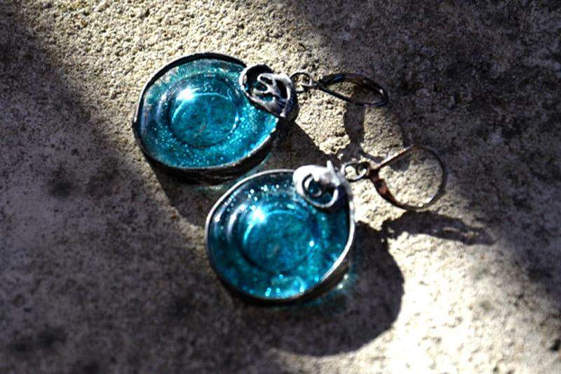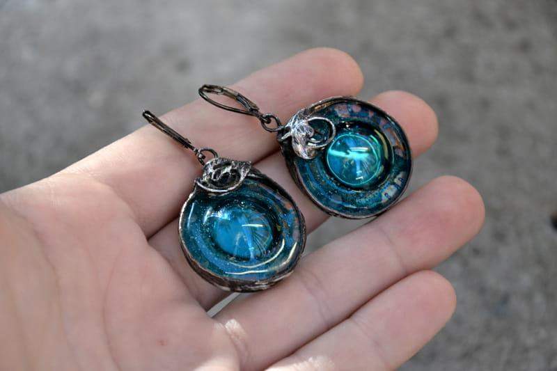 Romantyczne kolczyki ze szkłem. Oprawa wykonana z ekologicznej cyny kolorze starego srebra nadaje kolczykom uroku. Długość całego kolczyka to ok. 5 cm. Bigle antyalergiczne. Biżuteria w 100% wykonana ręcznie, poszczególne sztuki mogą się minimalnie różnić.